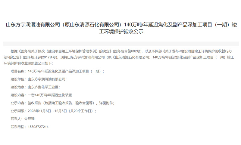 根據(jù)《國務(wù)院關(guān)于修改〈建設(shè)項(xiàng)目竣工環(huán)境保護(hù)管理?xiàng)l例〉的決定》(國務(wù)院令第682號),以及環(huán)保部《關(guān)于發(fā)布<建設(shè)項(xiàng)目竣工環(huán)境保護(hù)驗(yàn)收暫行辦法>的公告》(國環(huán)規(guī)環(huán)評[2017]4號),現(xiàn)將山東方宇潤滑油